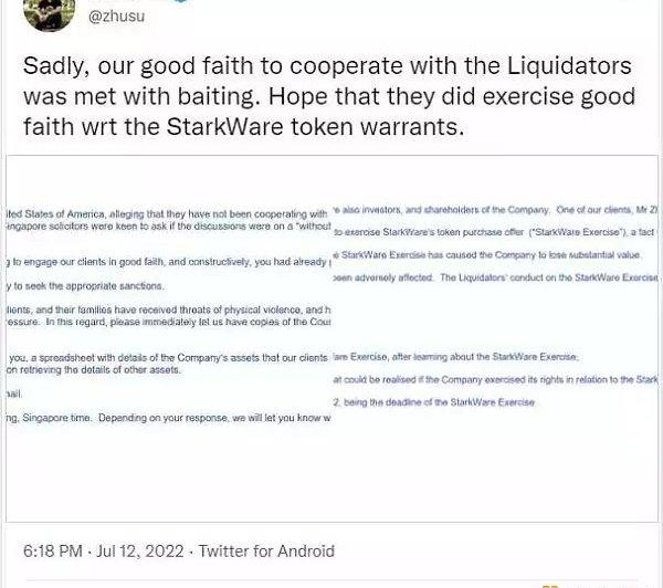 在7月8日提交给这起美国破产案的文件中,负责清算该基金的顾问表示,SuZhu和KyleDavies尚未与他们合作,且这两位创始人也下落不明。针对这一指控,7月12日,SuZhu发推文表示,他们与清算人合作的「诚意」努力「遭到了诱导」(编者注:也即SuZhu表示清算人的指控是在诱导3AC的客户/债权人)。SuZhu、KyleDavies以及他们的律师没有回应置评请求。