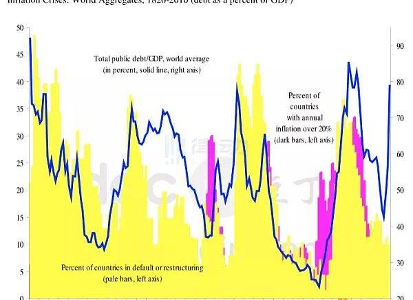 在过去40年里,我们见证了多次新兴市场的主权债务危机,但自第一次世界大战结束以来,我们还没有在发达国家见到过相似的情况。经济学家莱因哈德和罗戈夫在共同撰写的研究报告《从金融危机到债务危机》中,对过去两个世纪的主权债务危机进行了研究。在这200年里,债务占GDP比达到130%的国家,98%都出现了债务违约,大多数情况下以持续高通胀的形式呈现。现在美国的债务占GDP比已达到129%左右。