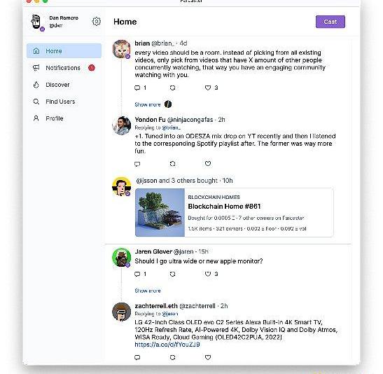 Farcaster是一个充分去中心化的社交网络。它是一个可支持众多客户端的开放协议,这一点类似于邮箱。用户可在应用程序之间自由地迁移社交身份,开发人员可在该网络上自由地构建具有新功能的应用程序。在Farcaster上,你可以发送简短的文字信息广播,连接你的以太坊地址。验证地址所有权后可启用一系列特色功能,包括展示你的NFT,将NFT用作经验证的头像等。arcaster是一个事关「切身利益」的社交网络,重要的不仅是你所说的话,也包括你能在链上证明什么。