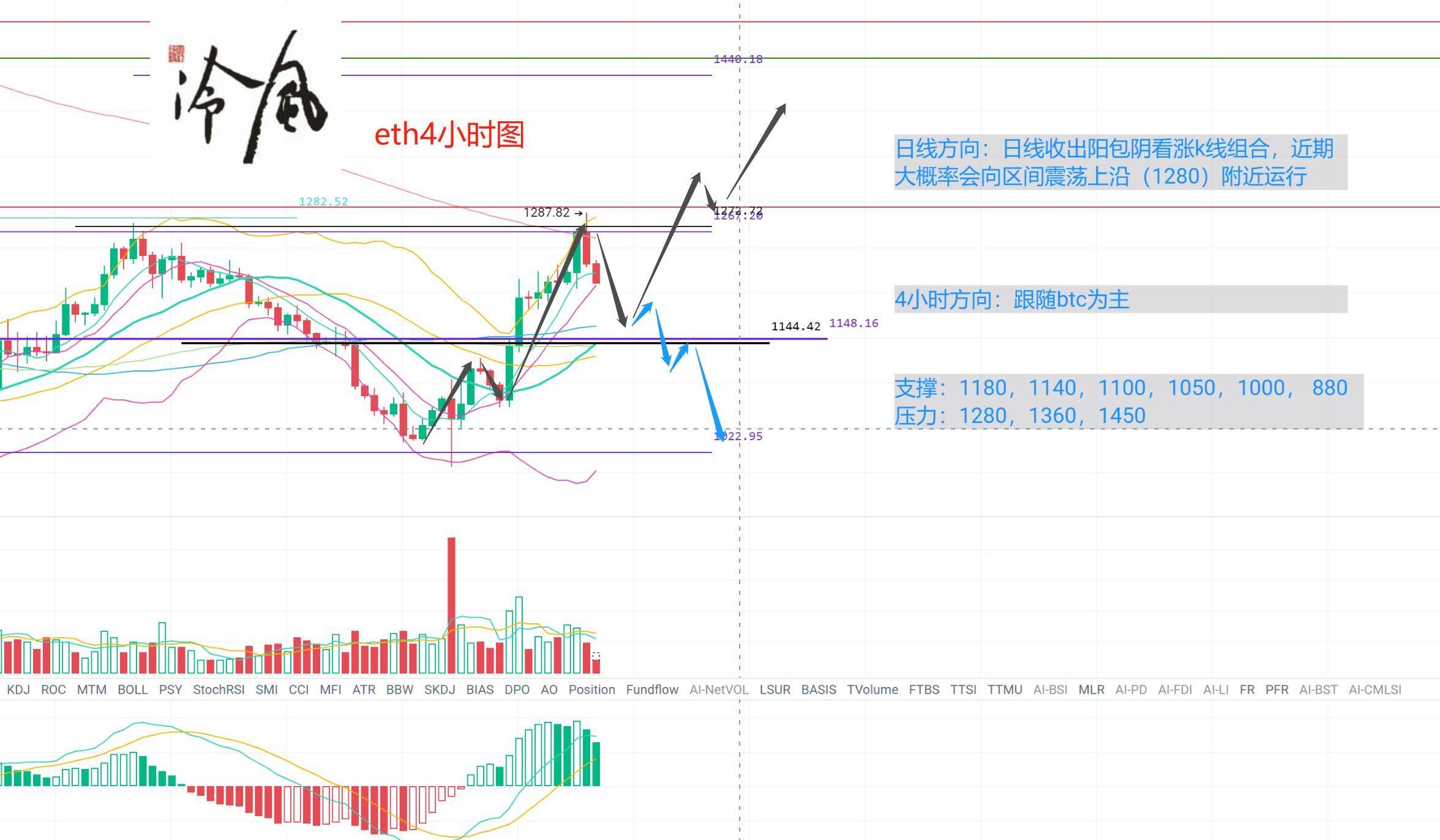 1900/1/1 0:00:00四小时级别中,大饼位于中轨上方震荡,不断试探上发压制,有提前进入横盘迹象,技术指标中,BOLL均线开口,MACD多头能量柱保持放量,进攻线与防守线多头排列向上发散,由此证明目钱短期多头占优.