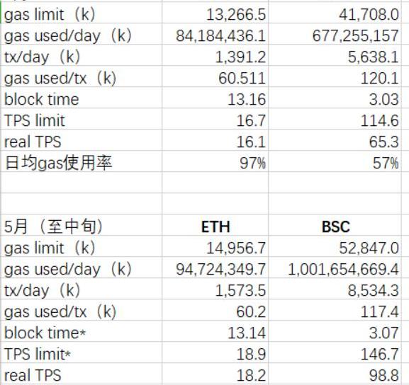 在器上分别对应各链的相应时间并取平均得到的ETH数据和TPS的数据、BSC取得6个分别为18.9和17。