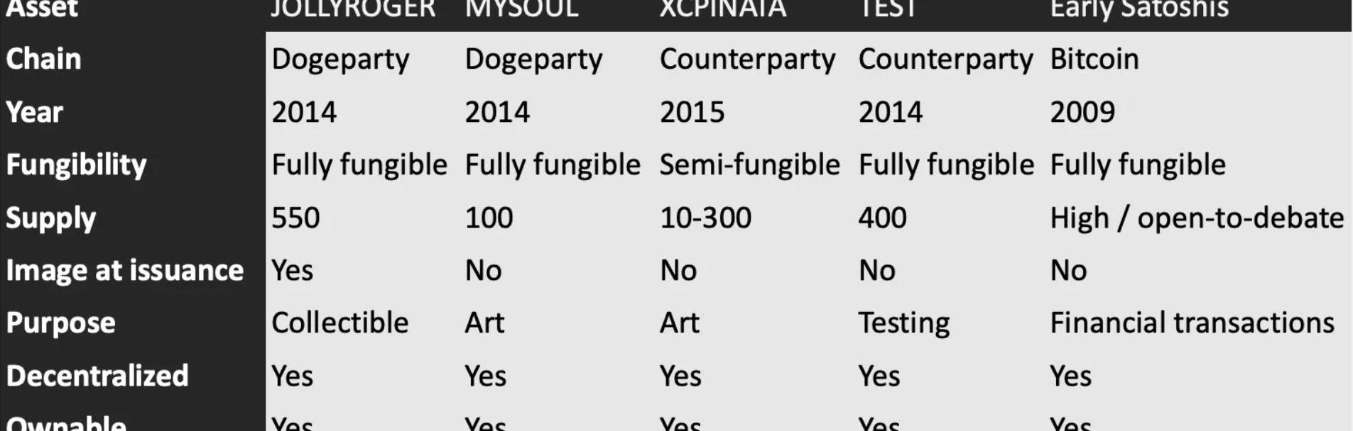 稀有资产具有收藏价值,资产可能在发行时具有一定的特征而变得具有稀缺性,或者说在时间轴上象征某一里程碑事件。例如在2014Dogeparty发行JOLLYROGER,它是Dogeparty代币,在发行时附有图像。虽然每个代币在JOLLYROGER中都是可替代的,但由于发行时附有图像,因此JOLLYROGER在创作过程中具有收藏价值。著名加密艺术家RheaMyers在2014年创作了MYSOUL概念艺术品,MYSOUL虽然没有附加图像,但可拥有且可交易性使它具有收藏价值。同样Counterparty上的XCPinata资产也具有艺术价值,虽然实际图像在后来才附上的,但是最初的创作意图使它成为一个重要的收藏品。
