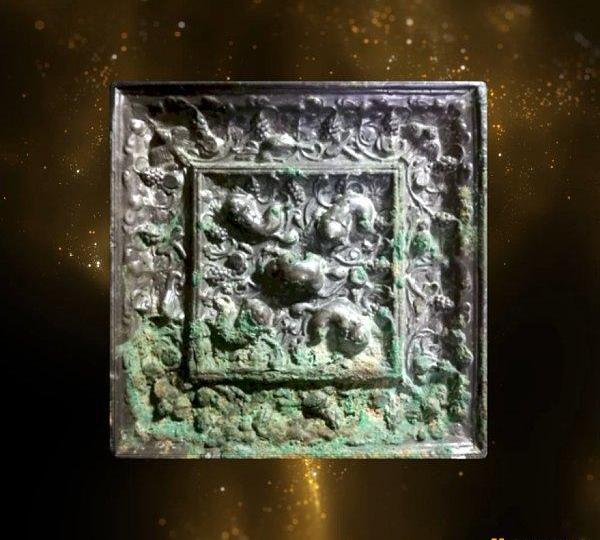 本次藏品原型为方形海兽葡萄镜,对角12.9厘米,边长9.3厘米。因在唐代方形铜镜形制稀少罕见,故有“一方顶十圆”之说。