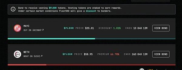 Bonding是FloorDAO获取流动性的主要机制。绑定是用户将其NFT出售给协议以折扣价获得$FLOOR的过程。该协议为绑定者报价了$FLOOR的价格和代币归属期,收益来自债券持有者通过将NFT存入FloorDAO获得的折扣$FLOOR。