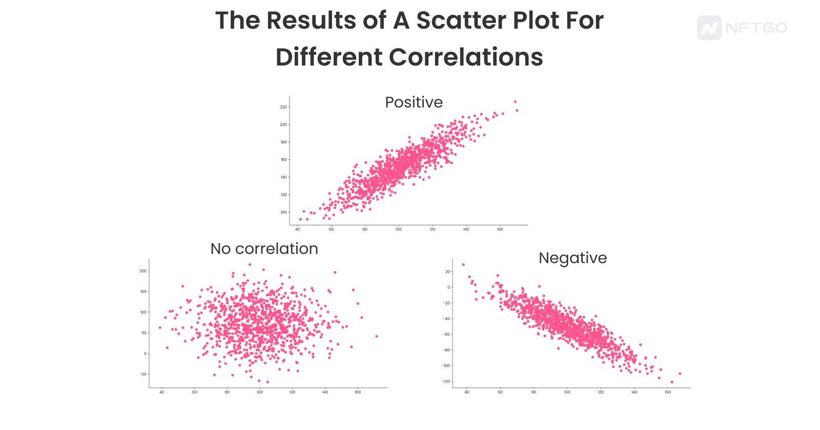 接近1的相关系数意味着这两个值之间存在一对一的关系。在我们的案例中,这意味着NFT市场紧跟ETH的市值。另一种情况可能是,NFT和ETH的市值有微妙的关联。在这种情况下,相关性将接近于零。我们可以使用散点图来说明NFT市值和交易量之间的相关性。在我们研究结果之前,下面的图表显示了正相关、负相关或零相关的每种情况在散点图中的显示情况。