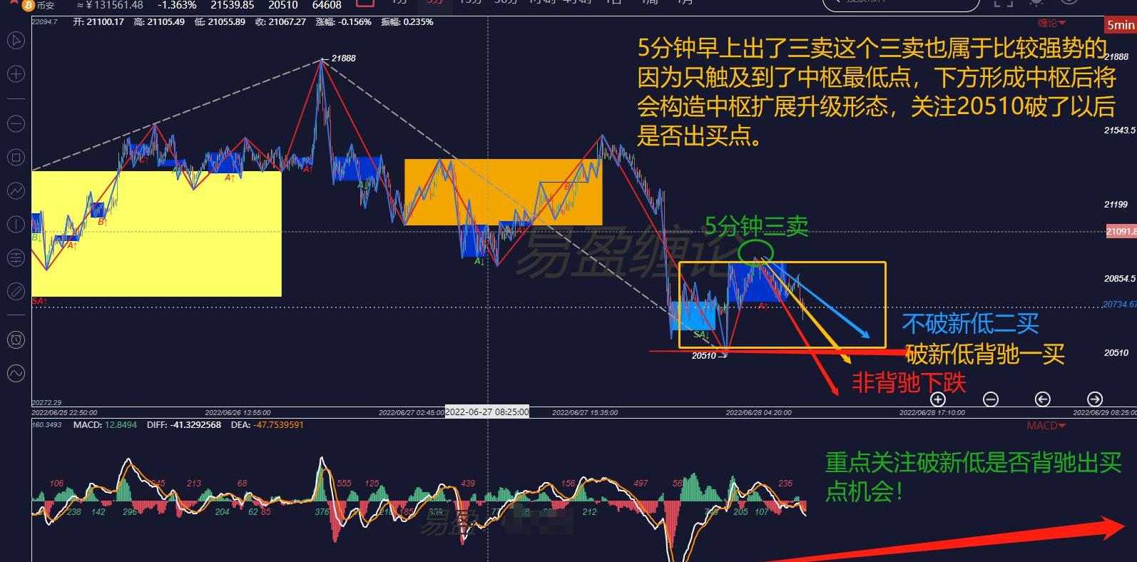 日内短线5分钟图看,三卖已经出现,当下再走5分钟向下线段。注意图中几种走势分类,特别注意再破20510后是否背驰走反向一段。日内最好机会为中枢第三段卖点机会。