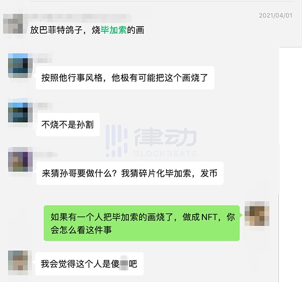 「这是一件很不尊重作者的事,是哗众取宠的行为。」NFT 收藏家曹寅刚刚结束一场关于 NFT 科普的直播,一边快步走在大街上,一边发来了 15 段数十秒的微信语音,「很重要的一点是,如果烧毁像毕加索作品这样的杰作而没有得到艺术家的许可,这其实是对艺术家的侮辱。」