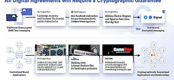 信任最小化通过技术手段,直接为应用的关键模块提供安全保障,消除差异和不对称性,使交易对手方处于平等的地位。这将有效恢复用户对应用的信任。由于主流聊天软件无法保护用户隐私,因此催生出了端到端加密技术以及Signal等新型聊天软件。E2EE通过加密手段为用户保障隐私,不依赖通信服务商未经验证的简单声明。