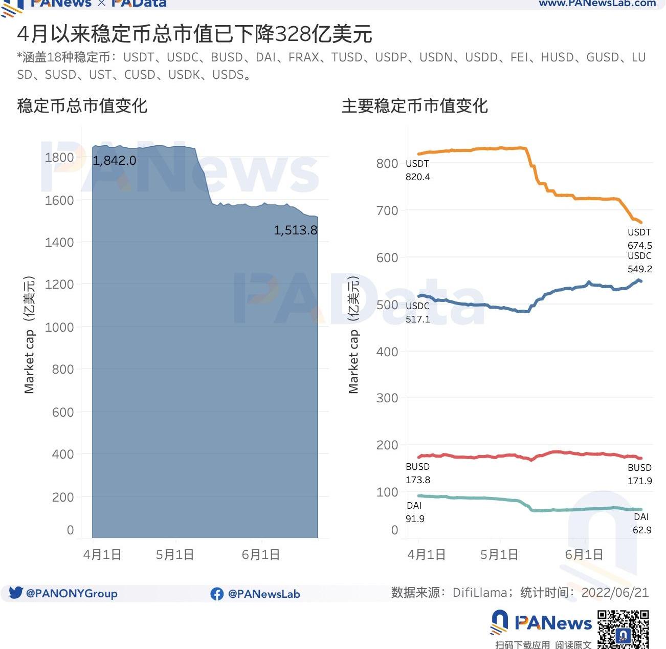 稳定币由于其交易媒介的功能一直以来都是观察市场流动性的一个重要窗口,稳定币增发通常意味着流动性增强,反之亦然。PAData统计了18种市值较大的稳定币自今年4月以来的市值变化情况,包括USDT、USDC、BUSD、DAI、FRAX、TUSD、USDP、USDN、USDD、FEI、HUSD、GUSD、LUSD、SUSD、UST、CUSD、USDK、USDS。根据统计,18种稳定币在4月1日时的总市值还有约1842亿美元,但5月8日至5月14日期间,总市值断崖式下跌,从1837.3亿美元跌至1578.6亿美元,减少了259亿美元,跌幅达到14%,相当于这期间每天都下跌2%。此后,6月10日至6月21日,总市值出现了短期内第二次明显跌幅,从1578.8亿美元跌至1513.8亿美元,再减少了65亿美元,跌幅约为4%。总体而言,4月以来,稳定币市值已减少了328.2亿美元,整体跌幅达到17.82%。