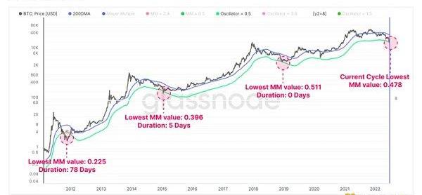 比特币的宏观价格走势往往遵循这一框架。如果我们将?200?日移动均线作为长期均值,梅耶倍数记录上方和下方的价格偏差,分别表示超买或超卖情况。