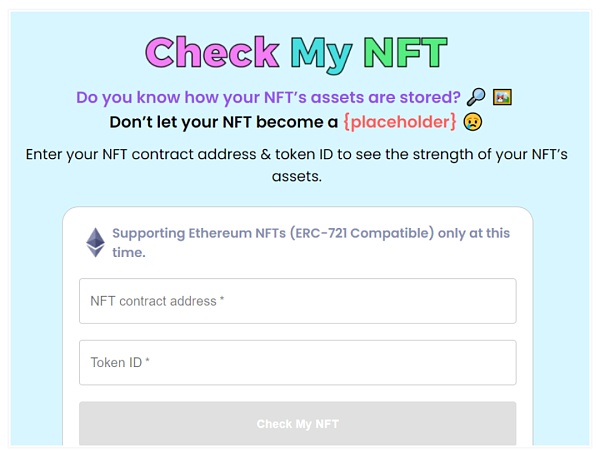 为此,网站checkmynft.com提供了相关服务,该网站允许用户查看他们的NFT是直接存储在区块链上还是存储在一定会在某个时候被删除Google Drive或Amazon帐户中。