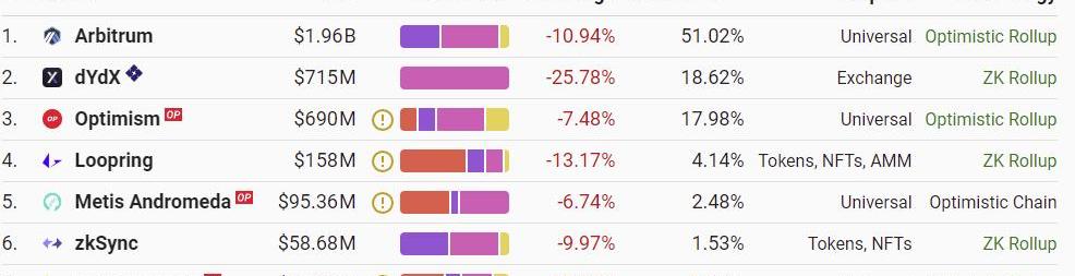 显然,Arbitrum是这里唯一的亮点,它现在拥有51%的Layer2TVL市场份额。NEAR也将其TVL增加了两倍,达到2.9亿美元(原本的基数很小)。