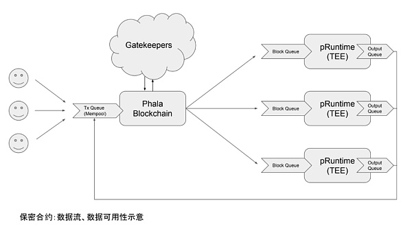 Phala则是把具备TEE的计算节点(被称为Gatekeeper)接入网络,Gatekeeper的TEE计算区可以维护总帐本,其共识为与波卡一致的NPOS共识,可以快速出块。