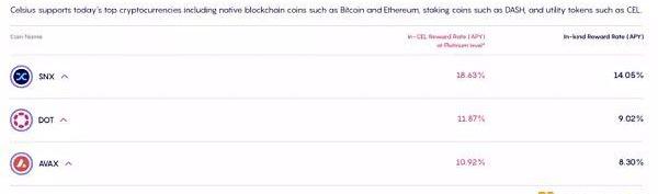 in-CelReward,存入一种Crypto资产选择用Celsius平台币CEL计算利息,整体APY更高。