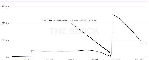 为了克服这个问题,TerraformLabs通过在AnchorProtocol中提供20%的UST收益,人为地创造了市场参与者对UST的需求。这种收益由Terraform售卖其Luna代币库来资助。为了防止价格下跌,TerraformLabs将需要不断地为收益储备提供资金,以支付20%的收益给UST持有者,这样他们就不会燃烧自己的UST去兑换Luna或美元。上述情况就发生在2月中旬,当时新一轮的收益储备增加了4.5亿美元,只为继续这场游戏。