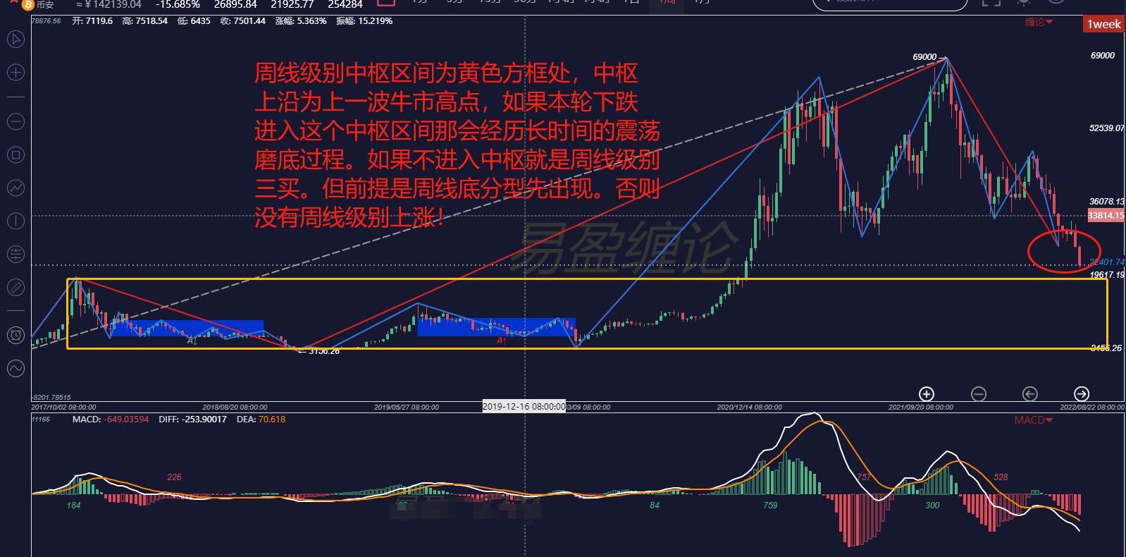 先来看大级别周线图,周线价格来到比较微妙的地方。黄色方框为周线级别中枢,中枢高点为上轮牛市高点19864.如果价格被拉回到中枢区间则意味着未来最少是月为单位的长时间震荡。如果不进入中枢区间则是周线级别三买。当然在周线底分型未出现之前都不会有大的反弹!