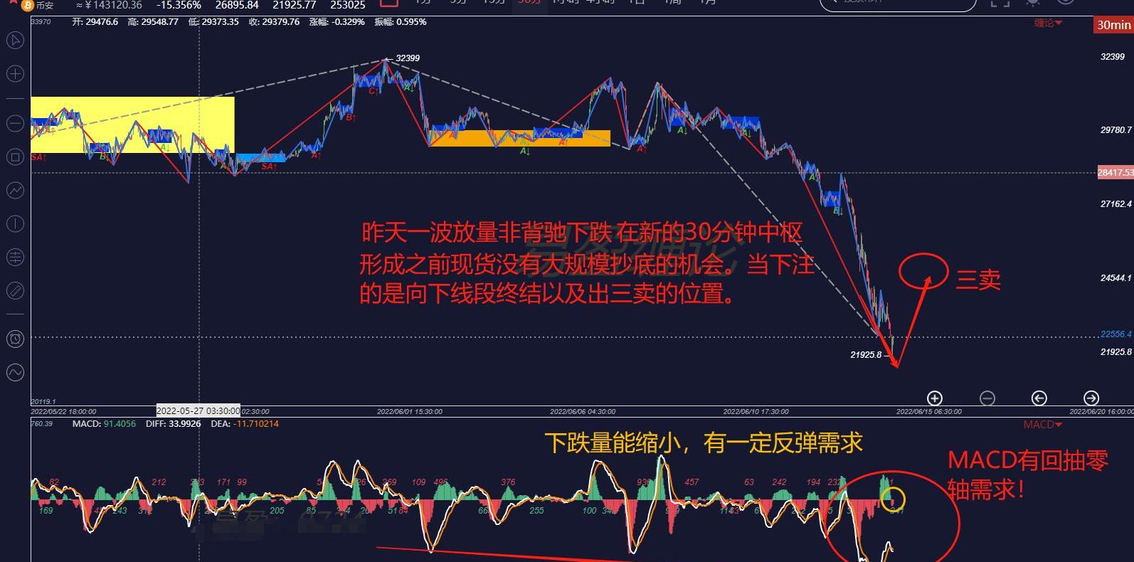 TC横了一个多月最终选择了向下,而向下放出了巨量!再次验证了一句话:横有多长竖有多高。昨天下午1点左右大饼26000点社群里提示三卖做空3500点空间稳稳入袋。当前看30分钟级别处于放量非背驰下跌,在30分钟没有出现二买之前没有大规模做多的机会。昨天上午写文章的时候当时价格27000附近,文章再次明确说了周线没有出现底分型之前,所有的做多都是短多,而且再次提出4小时三卖的威力最少是万点以上,实际情况从三卖高点32399到现在最低点21925回调已经超过10000点以上!现在谈抄底还为时尚早。