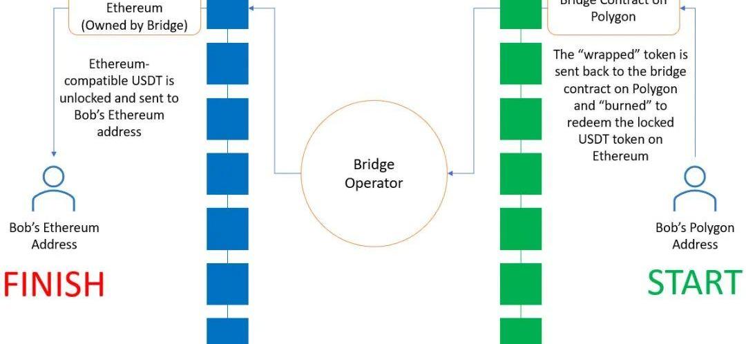 为了理解基于池的桥是如何工作的,现在让我们举个例子:一个想要将USDT从以太坊转移到Polygon的用户。用户首先将以太坊版本的USDT存入以太坊上的指定的合约地址(也就是池),并指定该USDT应归属于的Polygon网络上的接收地址。桥使用此信息将Polygon版本的USDT转移到指定的Polygon地址。