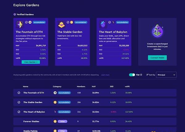 BabylonFinance是另一个专注于链上主动式资产管理的项目。具体来说,Babylon专注于社区治理的资产管理。用户可以创建“花园”,然后由其成员共同管理。