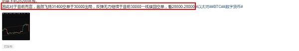 ????因此飞扬早间31400空单于30000出局之后,30000继续接的空单将持有,看28800-28000一线。下方等待28000一线企稳再多。喜欢飞扬的朋友可相互交流,共同进步!