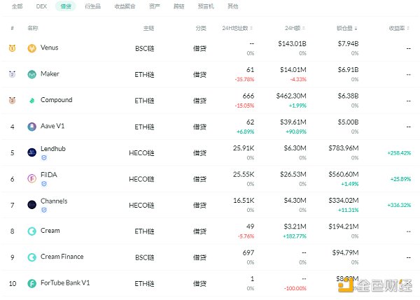 锁仓量排名前十的借贷平台 排名来源:DeFibox