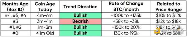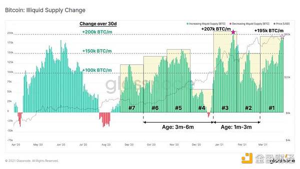 由于价格突破了上个周期的 ATH,大量币种成熟 / 持有(+207k BTC/ 月),如方框#3 中的大绿条所示(与方框#4 中的价格有关)。