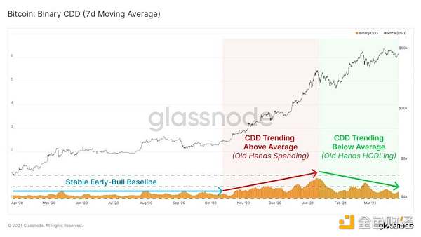 下行趋势(绿色): 累积的比特币天数比卖出的多这意味着持有行为占主导地位。