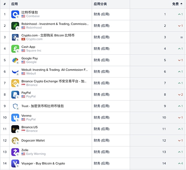 此外,有意思的是, 6 至 8 名都是币安旗下的应用,包括被币安收购的加密货币钱包 Trust、币安交易所和币安美国。