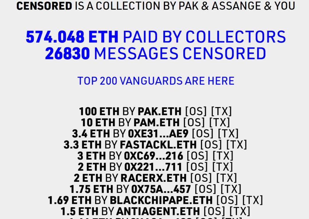 虽然该项目发起的初衷是为释放阿桑奇而募捐,但有趣的是该项目募集资金并不会直接捐献与阿桑奇家人或某特定组织,而是用于竞拍加密艺术家Pak的动态NFT系列作品《Censored》的其中一件——《Clock》。