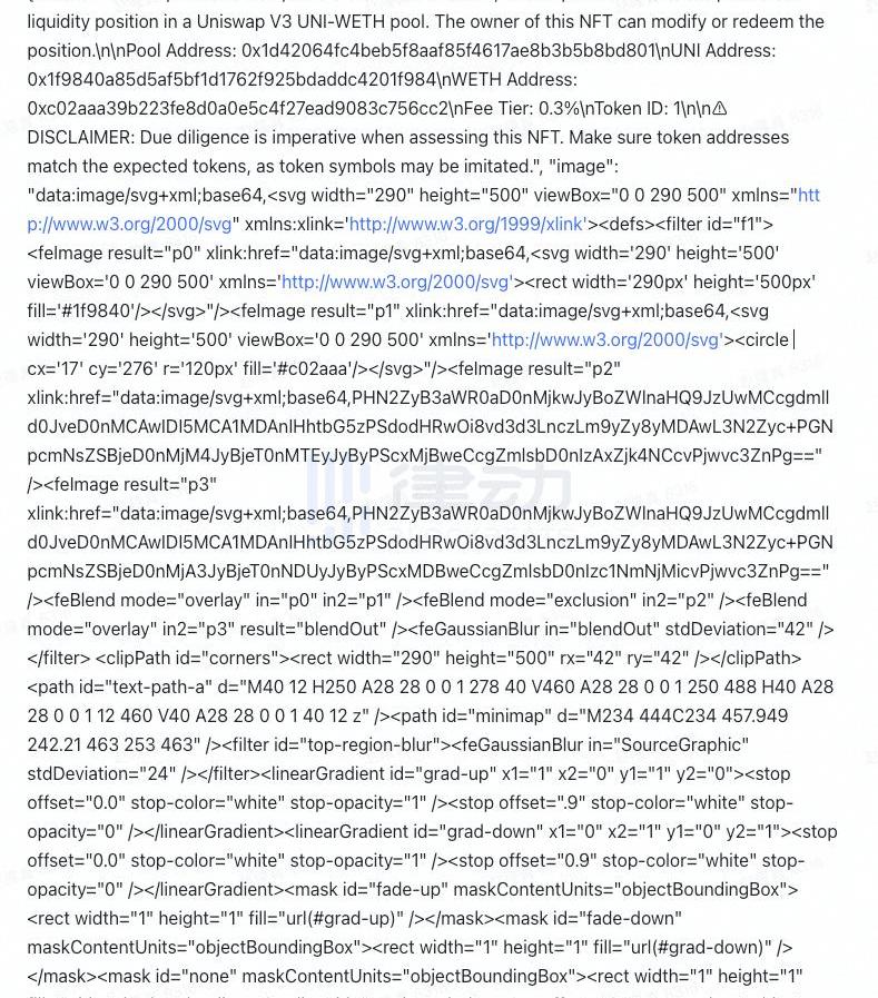 可以看到,在元数据的最前方标注了该做市头寸的代币对、做市价格区间、代币地址以及声明等信息。在后方的image字段内,保存的是以svg格式存储的NFT图像信息。