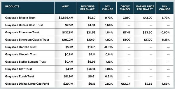 身为“机构之友”,灰度的投资喜好向来稳健,只限于主流资产和老牌币种,在其目前占据 99% 份额的单一信托基金中,共推出10支信托基金,投资标的为:BTC、BCH、ETH、ETC、ZEN、XLM、LTC、XRP与Zcash,此外,该公司还拥有多元化加密投资组合(Digital Large cap)。