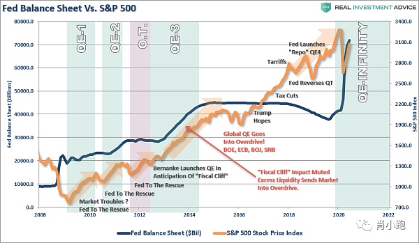 在全世界随便找一项资产,一个股指,比如标普或纳指;然后把价格标签从“美元”换成“美联储的资产负债表”。画风就立变: