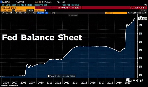 (写到这里,顺手查了一下:到今天(2021年4月23日),联储资产负债表继续扩张。总资产又增加了0.4%,达到7.82万亿美元的新纪录。联储资产负债表已经相当于GDP的36.4%)