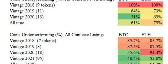 从命中率来看,在列出的所有代币中,91%在一年多前上市时落后于以太坊,70%落后于比特币。这些数字同样会随着您返回的越远而变得更糟。