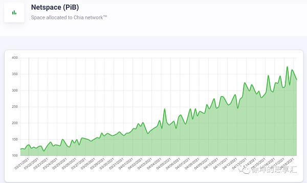 Chia主网开启一个月以来,算力稳定增长,截至2021年4月18日,Chia主网的算力为333PiB,峰值达到373PiB。