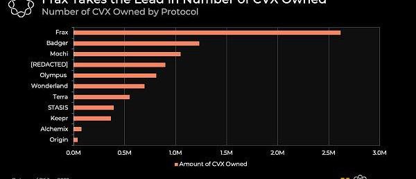 其他协议也一直在积累CVX,目前拥有最多CVX的是FraxFinance。REDACTED等DAO应运而生,提供“投票效率即服务”并积累对协议治理有用的生产性资产。CVX和CRV正好符合他们的要求。