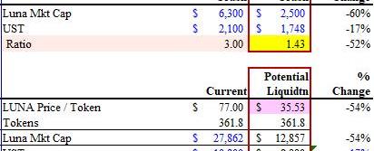 一旦挂钩失效,整个生态系统就会自反。如果LUNA跌入50美元附近的中高位,倾泻而出的清算和提款可能会使LUNA价格进一步跌至35美元。这时LUNA的市值可能会明显低于UST,形成恶性的铸销循环。