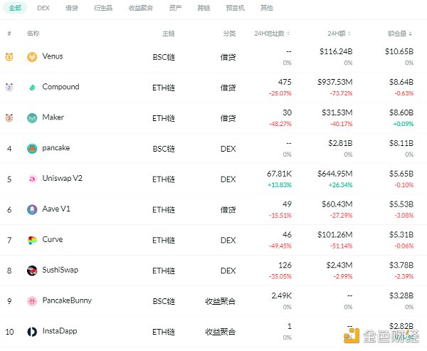 DeFi项目锁定资产前十排名及锁仓量,数据来源:Debank