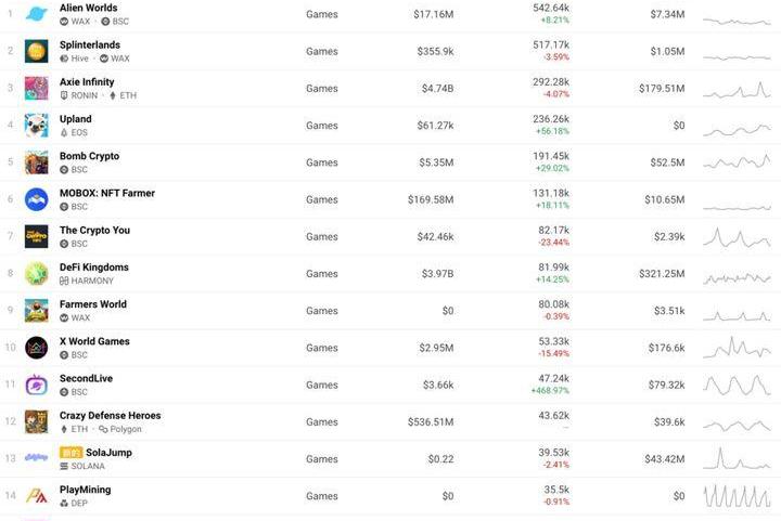 上周排在第五的Upland凭借用户量几乎翻了一倍,爬升到了本周第四位,BoomCrypto也有所上升,但不如Upland,被挤到第五位。