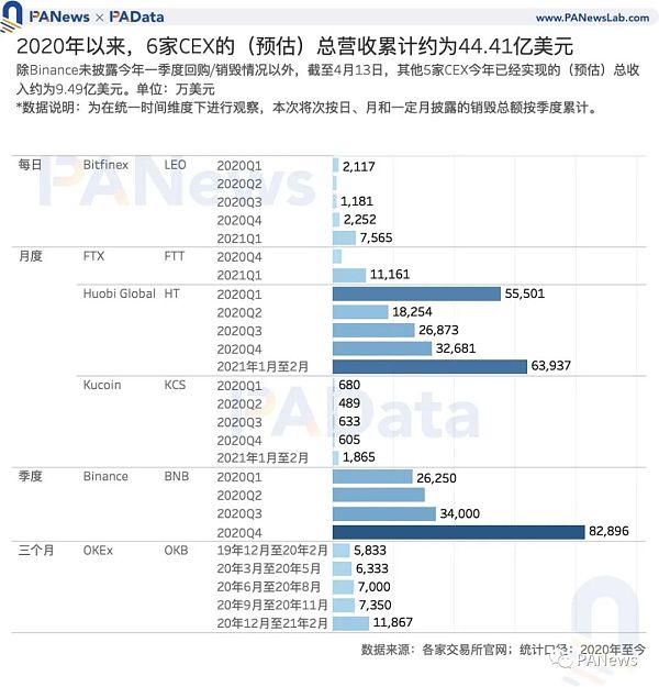 根据PAData的统计,2020年以来,6家CEX披露回购/销毁的平台币总数约为1.31亿枚,等值总额约9.46亿美元。其中,今年披露的回购/销毁总额约为2.19亿美元。按照不同交易所回购/销毁资金占收入总额的比例推测,6家CEX的(预估)总收入达到44.41亿美元,其中,截至4月13日,其他5家CEX今年已经实现的(预估)总收入约为9.49亿美元(统计期内币安尚未披露一季度销毁数据)。