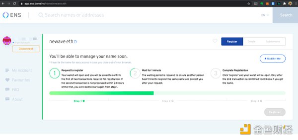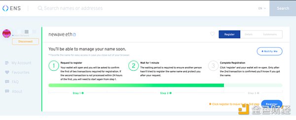 连接你的以太坊钱包(小狐狸),检索你想注册的域名。