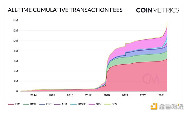 28.?Litecoin (LTC), Bitcoin Cash (BCH), Ethereum Classic (ETC), Cardano (ADA), Dogecoin (DOGE), Ripple (XRP), 和Bitcoin SV (BSV)总共产生了1360万美元的交易费用。