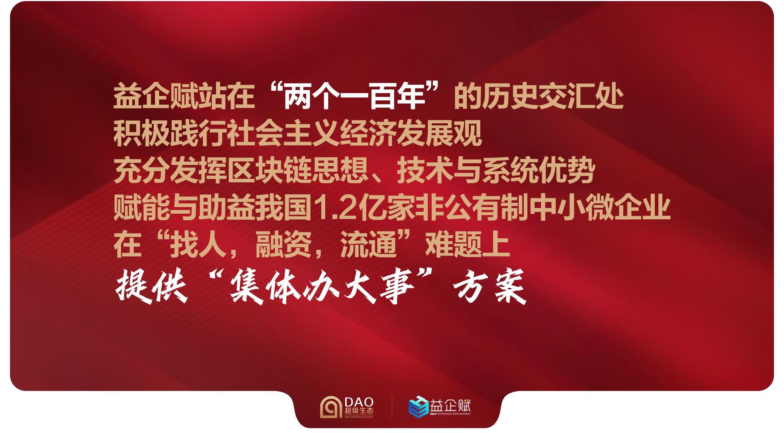 益企赋站在“两个一百年”的历史交汇处,积极践行......经济发展观;充分发挥区块链思想、技术与系统优势,赋能与助益我国1.2亿家非公有制中小微企业在“找人,融资,流通”难题上提供“集体办大事”方案。
