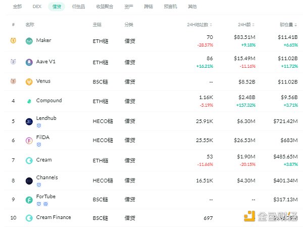 锁仓量排名前十的借贷平台 排名来源:DeFibox