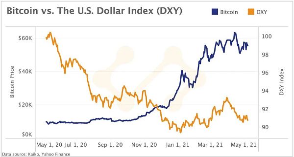 美元和比特币。在整个2020年,比特币和美元在很大程度上是背道而驰的。美元指数(DXY)跟踪美元与一篮子外币的关系。疫情引发的经济危机和随后的货币刺激措施导致DXY暴跌,而比特币却飙升至历史新高。然而,随着经济复苏带来缩减刺激措施的可能性,该指数最近显示出了复苏的迹象。如果这一趋势是比特币价格走势的任何指标,那么DXY在2021年的上涨可能预示着加密货币的亏损。然而,随着疫情在美国接近尾声,随着市场为疫情后的经济重新调整,可能会看到金融趋势的震荡。因此,只有时间才能告诉DXY-BTC相关性是否仍然是一个相关指标。