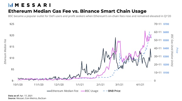 当以太坊的链上活动在2021年1月初突破其最大容量时,BSC的这些构建模块已经到位了。当以太坊的用户体验恶化时,BSC能够以4%的成本和3秒的区块时间提供一个较小但可用的DeFi生态系统。结果很明显:用户蜂拥至BSC,其链上活动在2月成倍增长。BNB是平台和DeFi流动性池的组成部分,BSC的繁荣助推了用户购买、部署和持有更多的BNB。