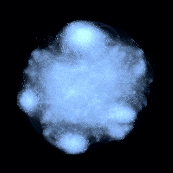 我们的下一步是在二维物理空间中铺设网络,以便我们能够最好地观察其结构。为了做到这一点,我们通过计算机模拟网络,以尽量减少节点之间的链接总长度。这确保了我们能够清楚地看到所有权的模式。由一个收藏家拥有的艺术品必须彼此紧密排列(因为它们之间有许多链接),而由几个 "分离度"(没有两个共同的所有者,但仍然可以通过一系列的所有者进行链接)连接的艺术品则必须相距较远。那些没有通过任何所有权链与其他艺术品相连的艺术品将作为孤立的节点或孤立的群组自由漂浮。
