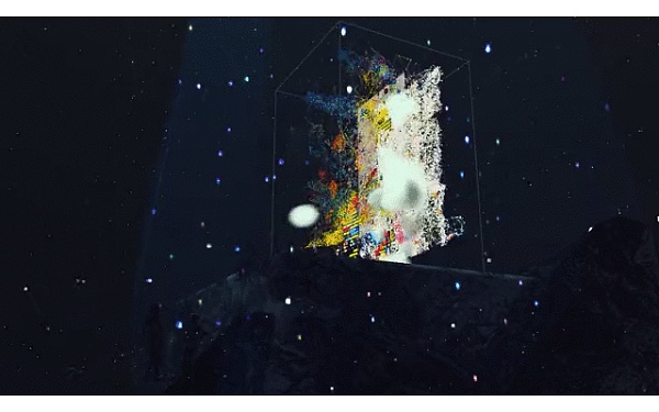 大型的数据改变我们的视觉体验。朱佩鸿+Lilyo用红外感应和编程算法创作3D影像,延续他之前抽象绘画的创作思路,高纯度的色彩单元以有机的韵律与观众互动。打散的粒子构建山水,组成形象,契合了CryptoVoxels的像素空间。