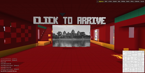在Metavers(元宇宙/数字世界)的代表项目中,CryptoVoxels是一个像素化的可编辑空间。与追求精美视觉的Decentraland和复杂结构的Sandbox不同,CryptoVoxels的粗糙质地衍生出一套乐高化的空间美学。甚至有些粗暴的体验成了一个激进概念的实验场。很难想象在电子质感的建筑群落中坐落着一座中式庙宇。这座位于地图东北角的赤金ChiJin,一座大佛贯穿红色的建筑,是整个版图中东方气质的风格代表。漫天飞舞的avatar(虚拟形象)围绕在像素搭建的寺庙周围,这是宗教的游戏化转型,抑或是其从内容渗透Metavers的埋伏?