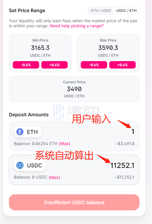 我们只需要在下方的 ETH 存入数量中输入 1,系统便会自动帮我们计算出对应需要提供的 USDC 的数量(见下图)。可以看出,两个币种的市值,一个是 3,491 美元,一个是 11,252 美元,已经不是原来 V2 版本中 1:1 的比例了。